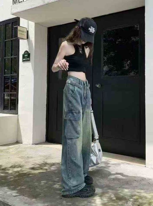 美式复古工装直筒牛仔裤女秋季宽松高腰显瘦水洗阔腿裤子拖地裤,独立包装带...