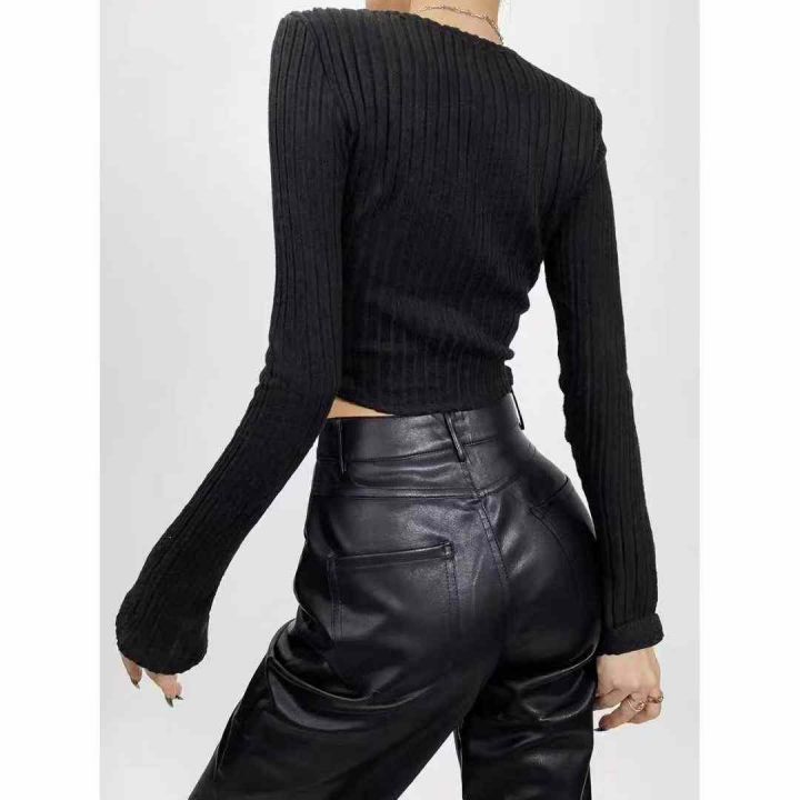 3.5清电商仓回收770件黑色辣妹收腰褶皱长袖T恤方领打...