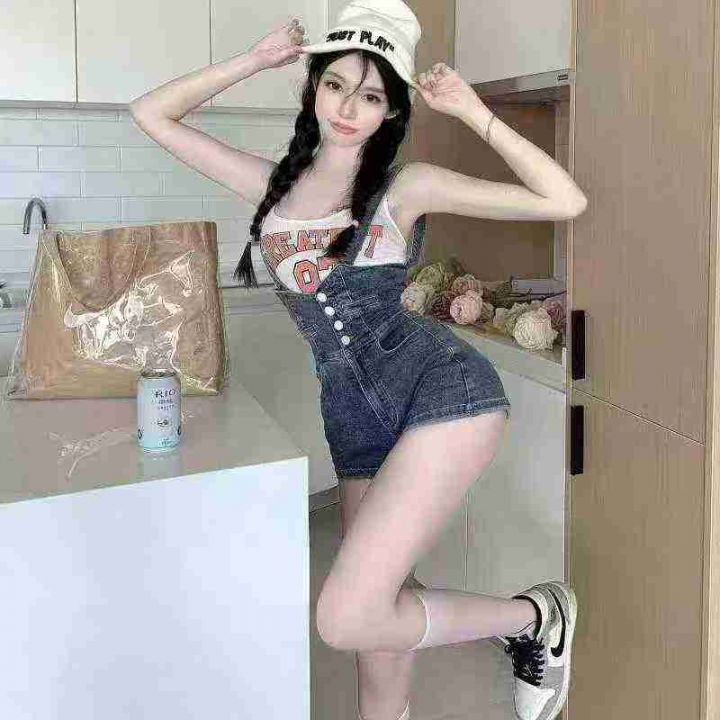 夏季新款靓妹女装弹力修身显瘦牛仔背带短裤,独立包装...