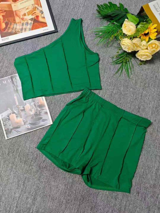 工厂回收84套外贸热卖绿色斜肩吊带短裤套装,码数S-XL。面料有弹性,全部独立包装。。 货号:1323