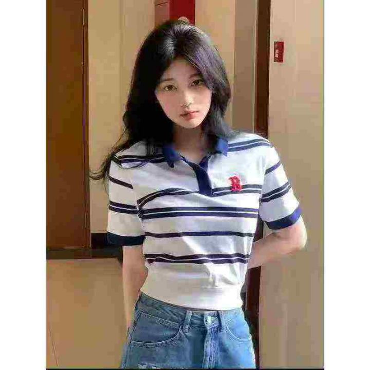 全清价5.9元正肩短袖t恤女短款辣妹小众条纹翻领polo衫...