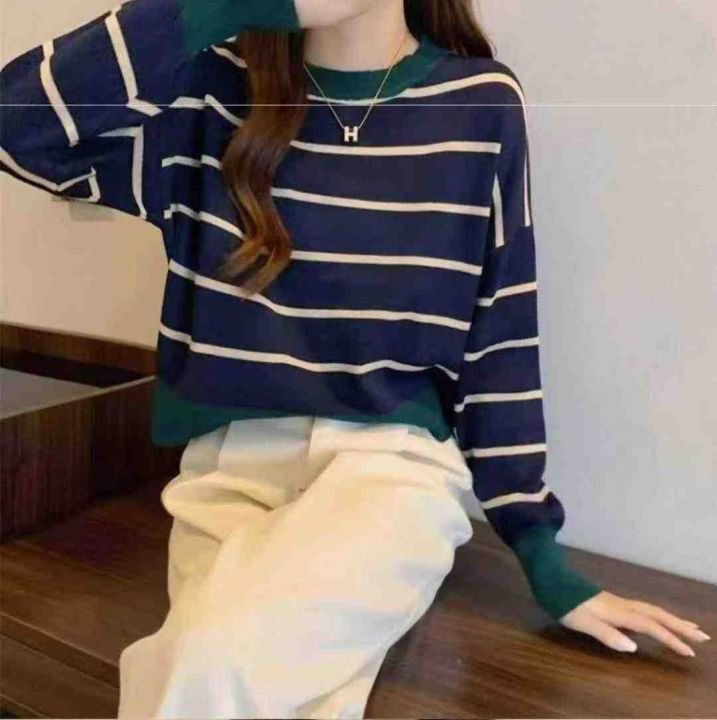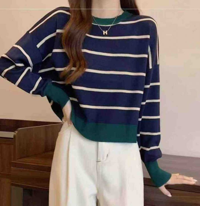 秋季新款短款宽松港味复古慵懒风撞色条纹针织套头毛衣...