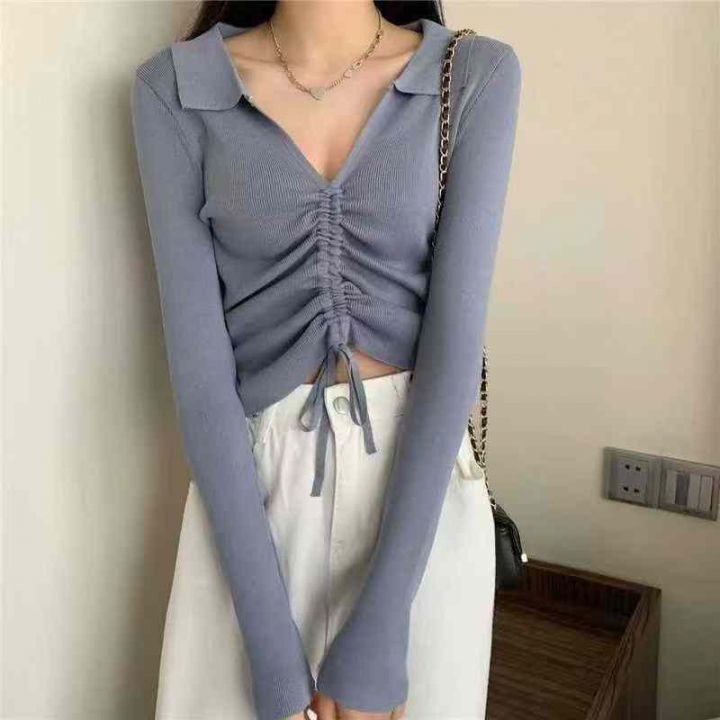 秋季新款韩版复古网红抽绳绑带设计款Polo领长袖针织套...