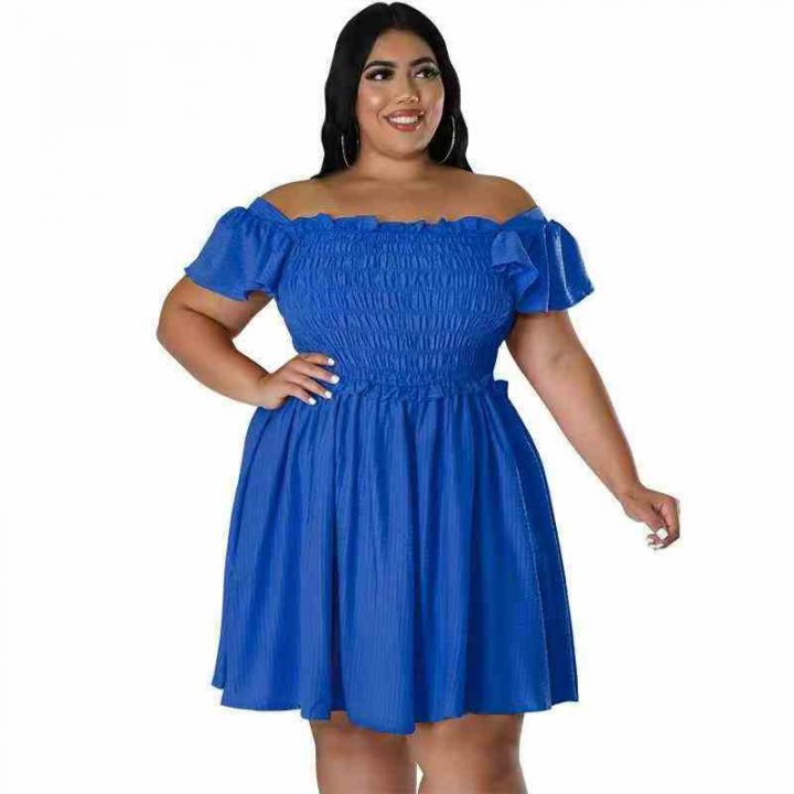 3000件左右,跨境欧美大码夏季女装一字领短袖大摆连衣...