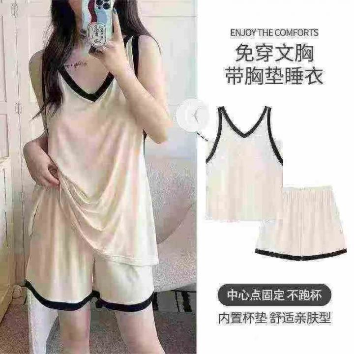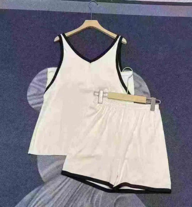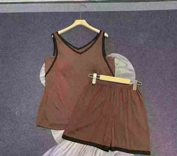 天猫在售款8000件左右高品质冰丝螺纹纯欲风女士宽松版家居服背心套装,高弹力带胸垫,单款三色,S-3XL,独立包装带吊牌
