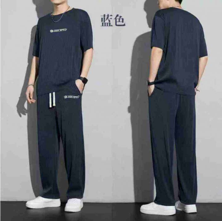全清价11.8冰丝运动套装男士帅气夏季休闲长裤子短袖t恤ins速干垂感套裤,独...