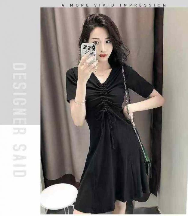 法式连衣裙94件6.9,面料有弹力,抽绳褶皱设计,码数M...