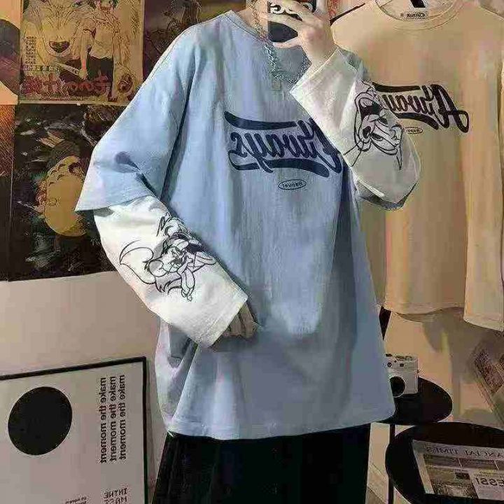 捡漏326件假两件长袖可爱图案t恤男潮牌嘻哈春秋棉T上衣,独立包装,码数M-2XL,分货加1,货号115#70