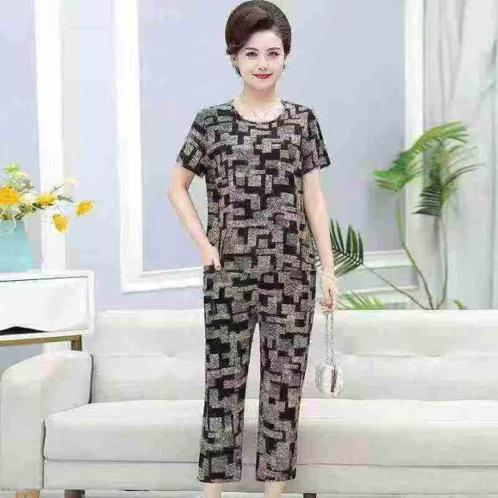 妈妈夏装套装冰丝亲肤凉快舒服可外穿中老年人女款上衣五分裤两件套,整款单色,XL裤长82厘米,码数L-3XL,数量222套,(货号0915#53)