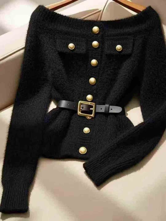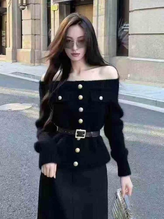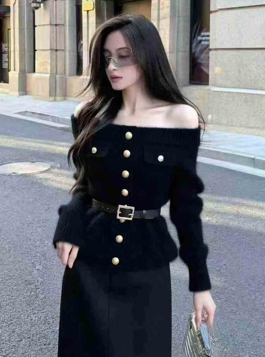全清18.8,气质名媛黑色一字肩水貂绒毛衣女装2025秋冬独特超好看加厚轻熟掐腰毛衣,均码11件。 货号:1323