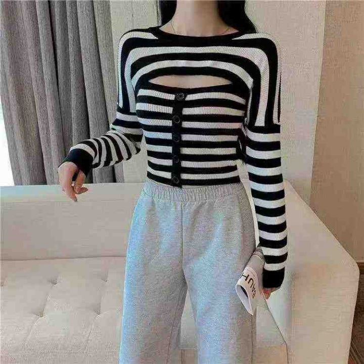 秋季新款撞色条纹软糯吊带背心+针织弹力修身上衣俩件...