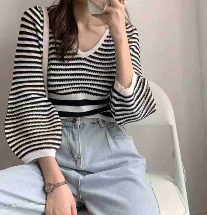 秋季新品撞色条纹宽松慵懒风短款针织V领套头毛衣,独...