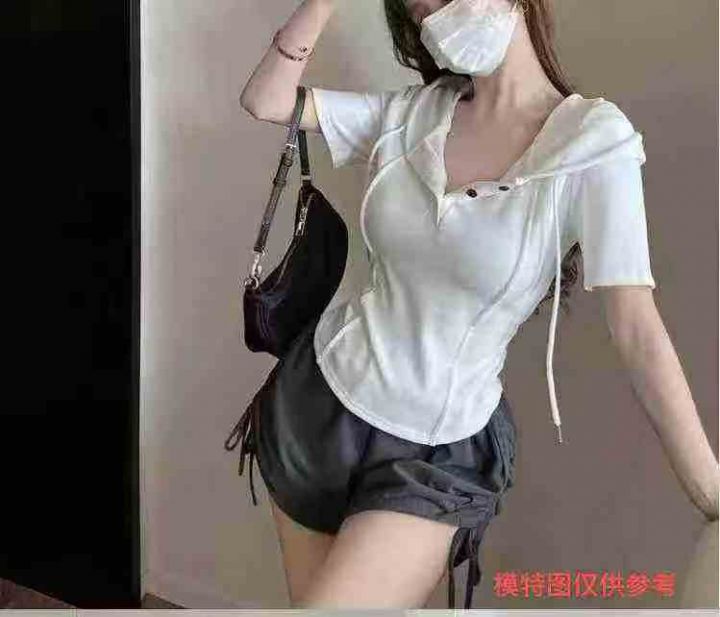 捡漏100件不规则连帽上衣打底衫夏季洋气修身显瘦短袖t恤女,独立包装,码数1-4码,货号1025#57。 货号:24862