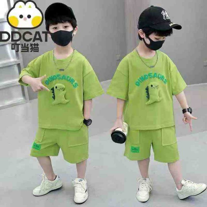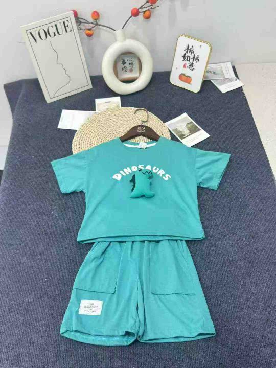 男童夏季套装2025新款洋气恐龙男孩童装衣服儿童帅气男宝宝夏装,数量612套,码数90-140,独立包装后领包边,恐龙可拆卸分开装的,全清9.9元。 货号:1303
