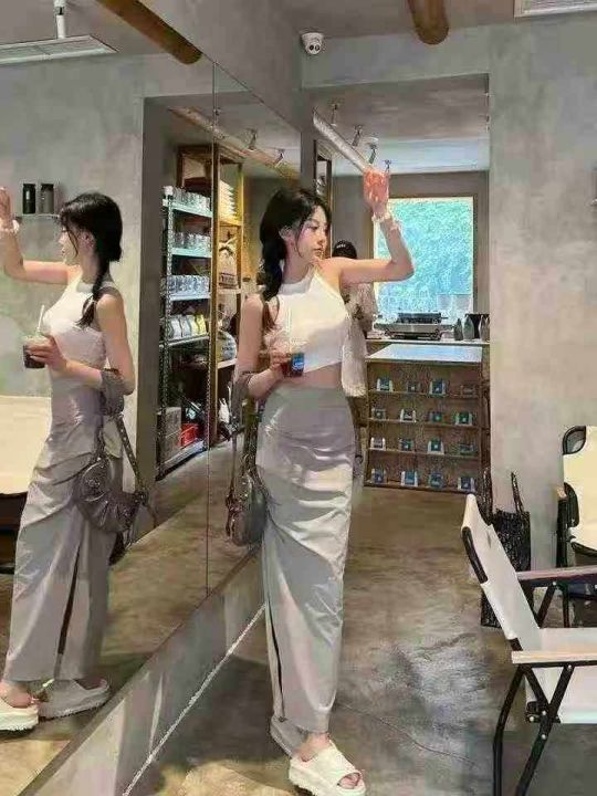美式欧美工装半身长裙女春夏辣妹褶皱高腰显瘦开叉包臀...