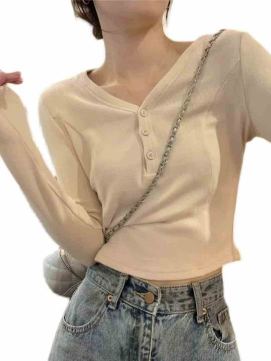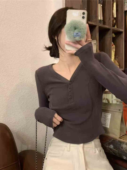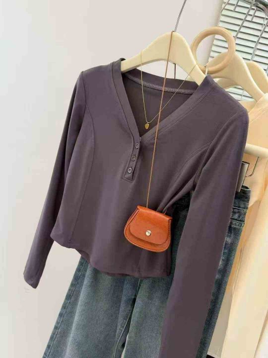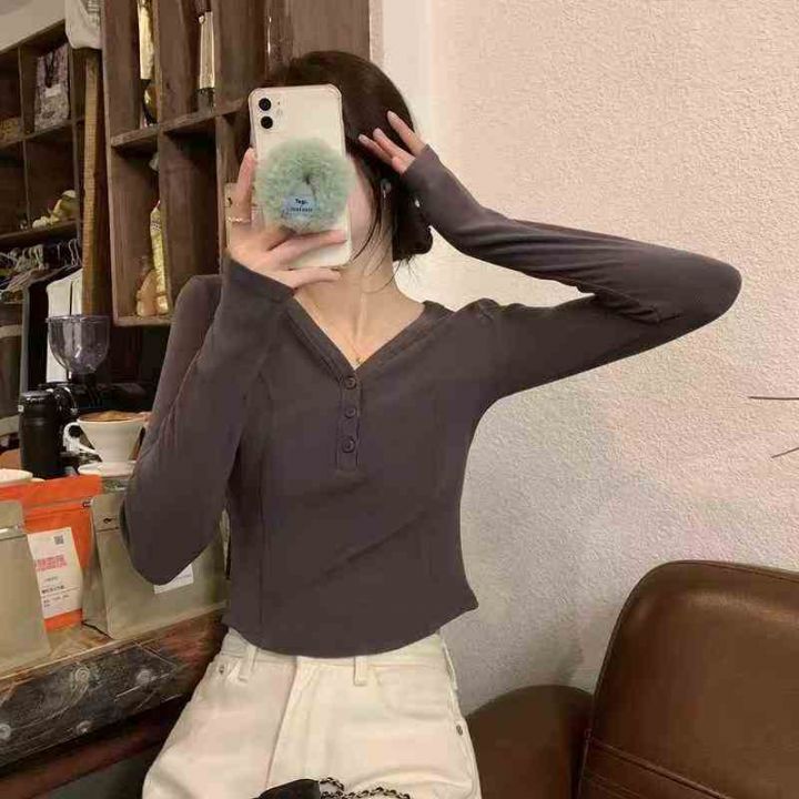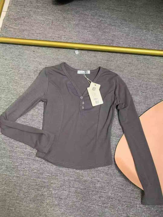 7.8清3500件纯棉辣妹靓妹修身百搭设计感显瘦V领长袖T恤女春秋季新款纽扣设计感打底上衣 码数均码 独立拉链包装 有吊牌 分货加一