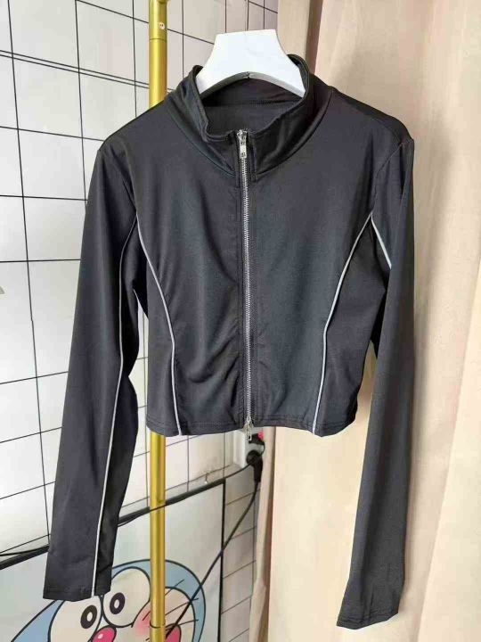 8.9清245件设计感双向拉链短款长袖上衣T恤外套女2025春秋新款修身显瘦高弹塑形长袖小衫 码数S-M-L 独立包装