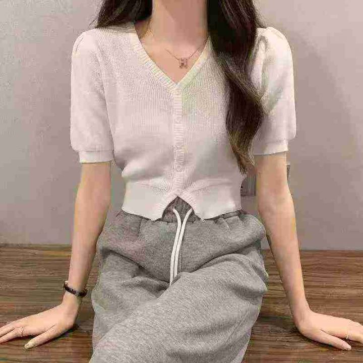 夏季新款法式V领短款收腰显瘦泡泡袖独特小众设计感针织短袖开衫,独立包装...