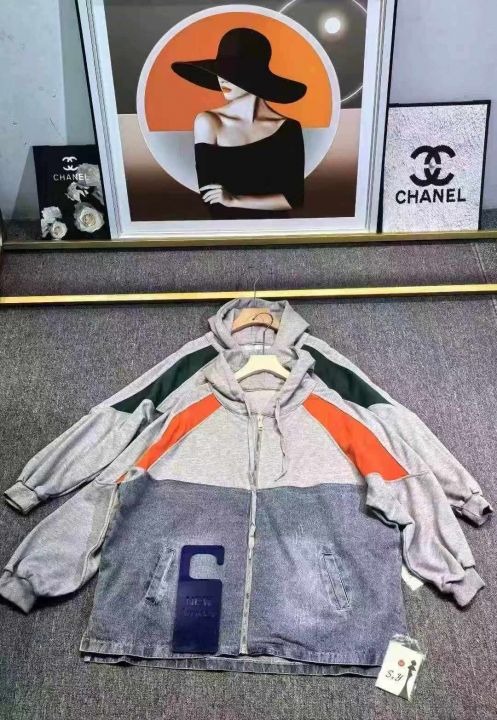 品牌胖mm秋季新款连帽牛仔拼接卫衣款运动洋气棒球夹克外套,合计19件,M-4XL,小码少,橘色多,原包原吊无瑕疵,万佳档口货,实体店品质