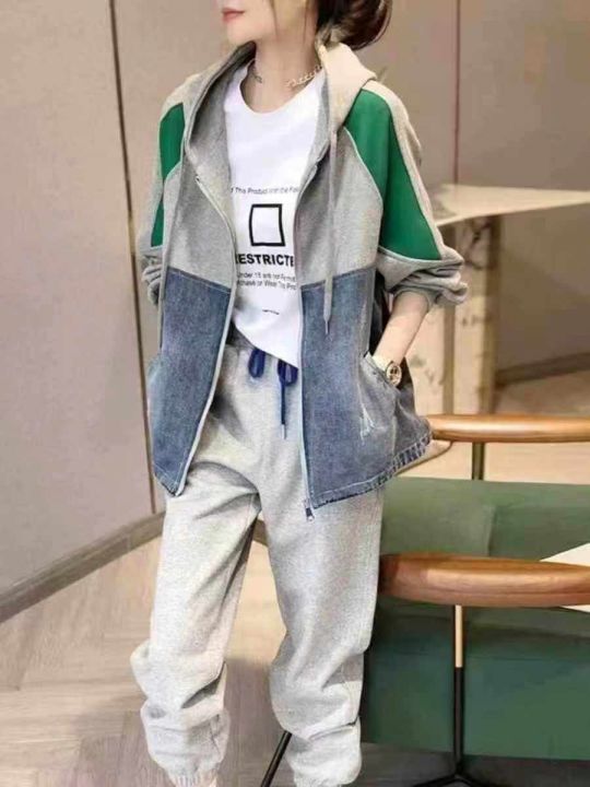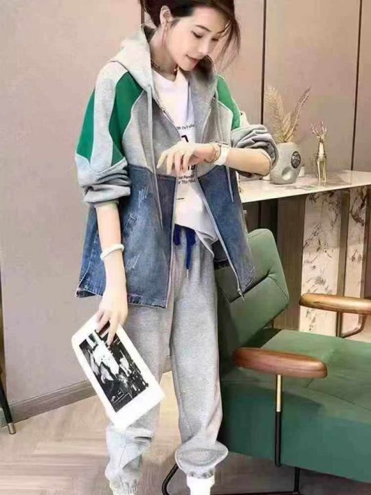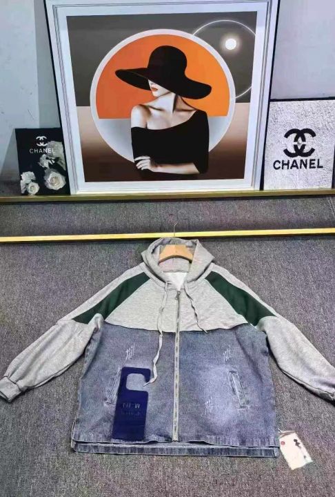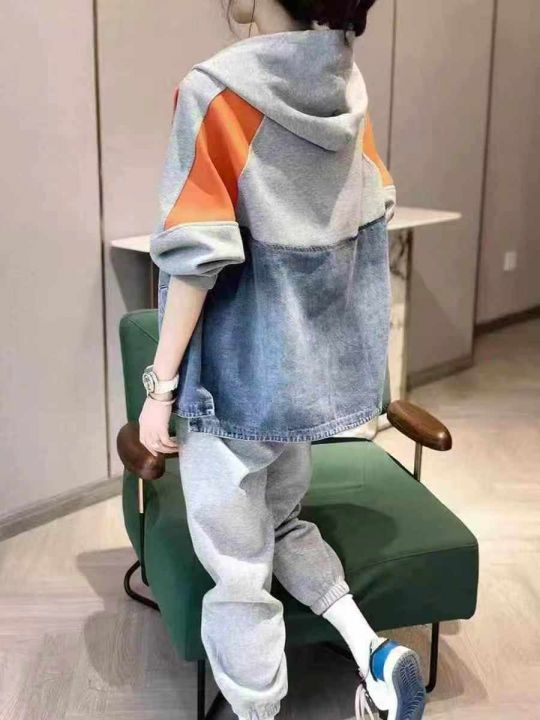 全清:23一件品牌胖mm秋季新款连帽牛仔拼接卫衣款运动...