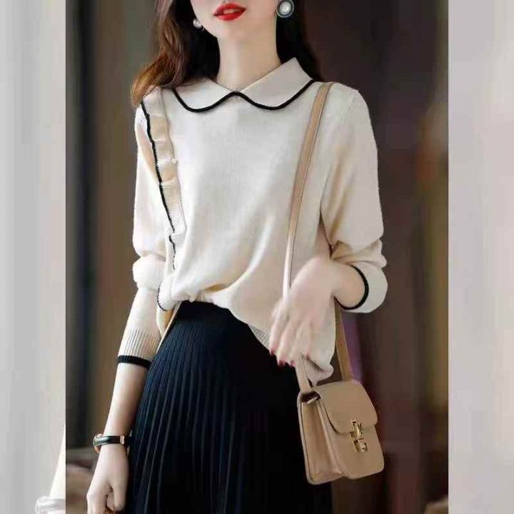 秋冬新款韩系温柔风撞色翻领长袖包芯纱套头毛衣,面料软糯舒适弹力大,宽松...
