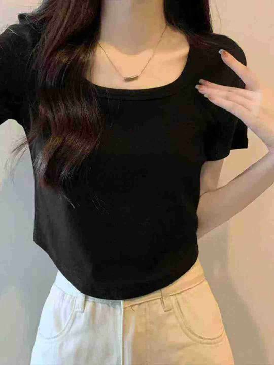 天猫在售款700件左右高品质夏季薄款方领螺纹纯棉靓妹短袖T恤,下摆弧形面料柔软高弹力,单款3色(杏色,蓝色多)S-XL,独立包装带吊牌