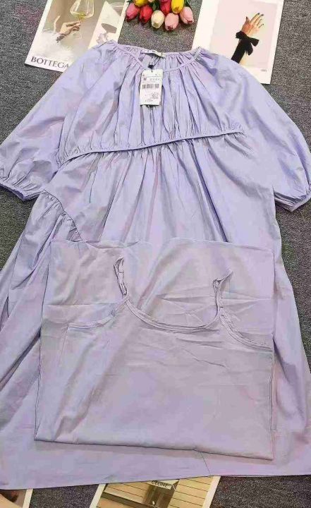 韩版宽松大版型不规则设计感温柔显白泡泡袖吊带两件套长款连衣裙,[爱心]360套左右,S胸围114,码数S-XL,穿80-160斤,万佳档口货,原包装️无瑕疵,[666]实体店品质,分货加一。 货号:1303