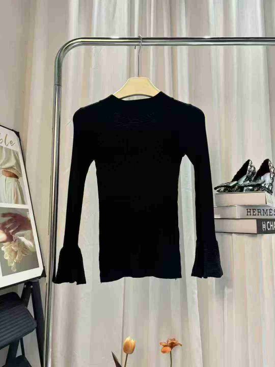 73件韩系靓妹款黑色圆领喇叭袖包芯纱针织衫女早秋小个...