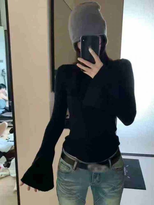 73件韩系靓妹款黑色圆领喇叭袖包芯纱针织衫女早秋小个子修身显瘦内搭气质打底上衣,质量很好!均码!高弹力!独立包装!零瑕疵便宜清4.9 不分货