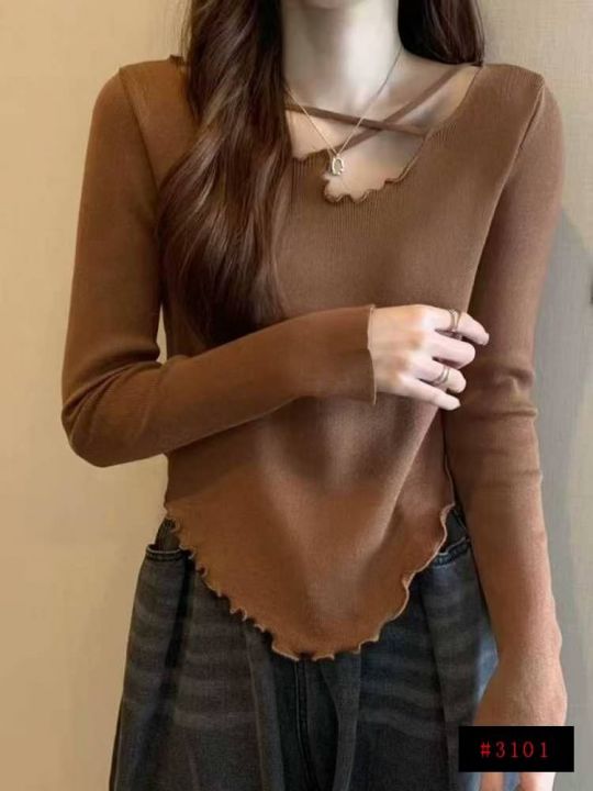 秋冬新款美拉德色系不规则辣妹纯欲风木耳斜边独特设计长袖针织衫,独立包装...