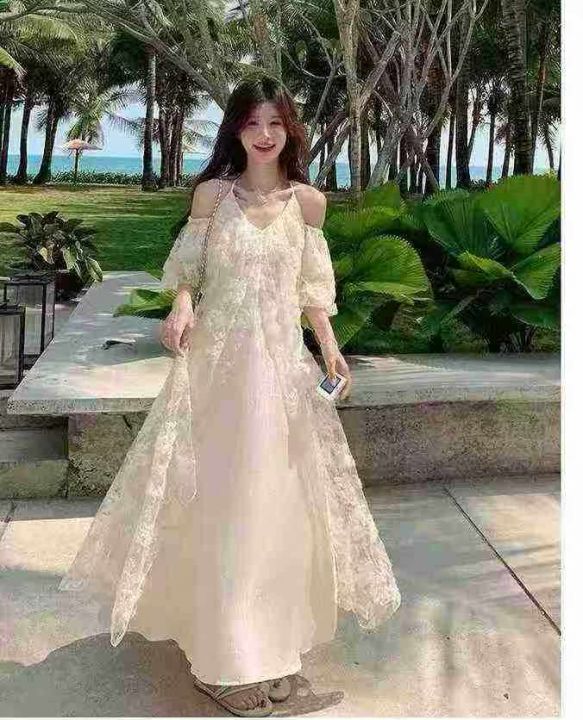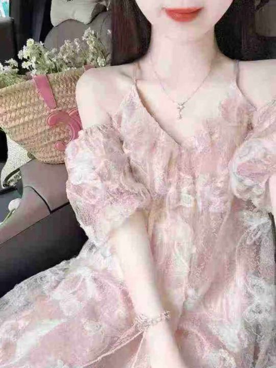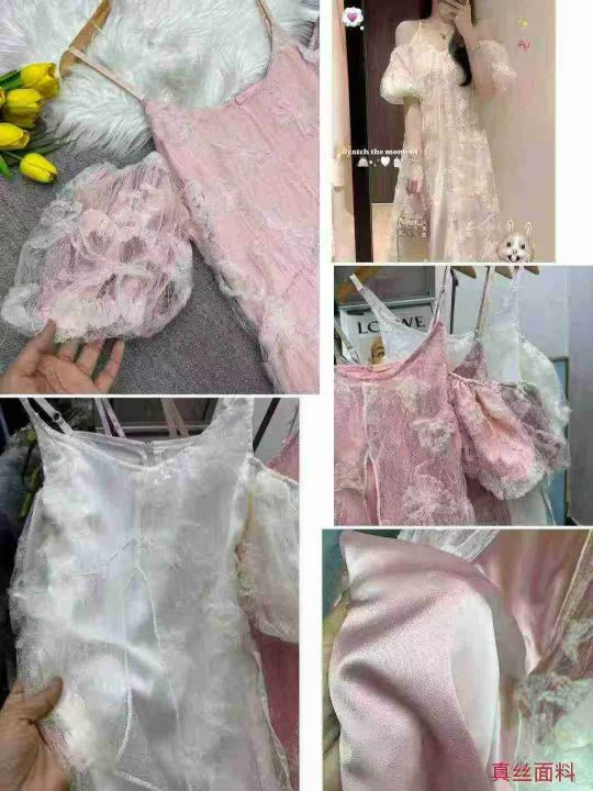 蝴蝶印花吊带连衣裙小仙女露肩宽松显瘦超仙气质长裙,独立包装,码数1-5码,数量140条,2码120厘米,大货粉色为主,货号1114#23