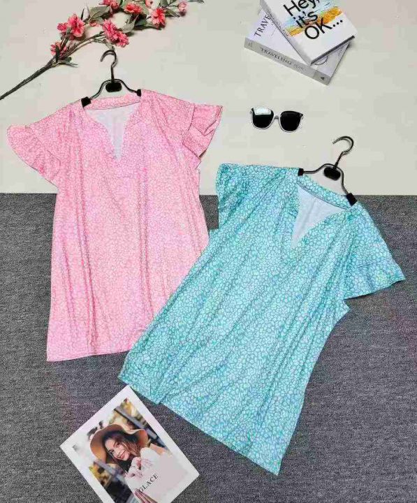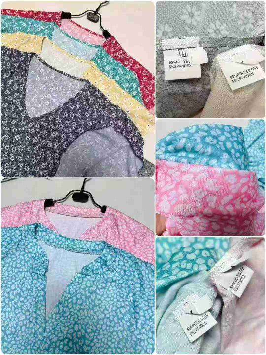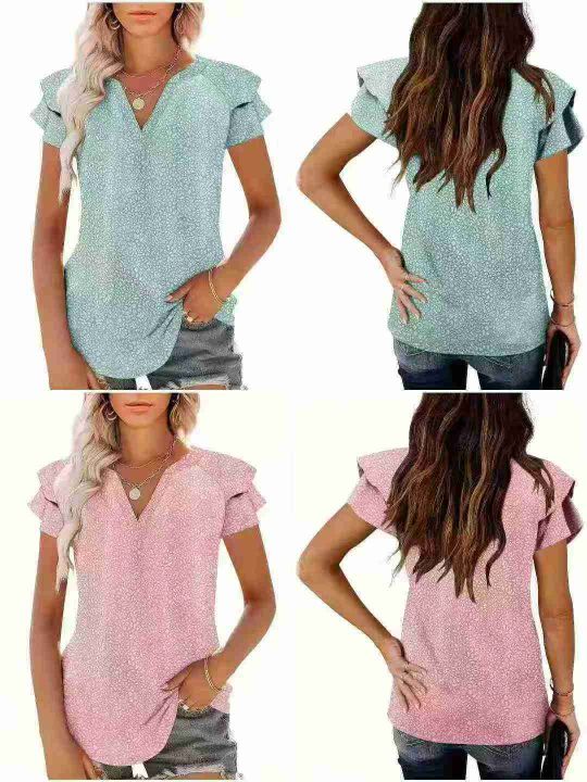 700件欧美时尚休闲V领印花荷叶边袖口短袖,整款,花型图案多,品质好,独立包装。s到5XL。梭织面料。亏本清。3.9