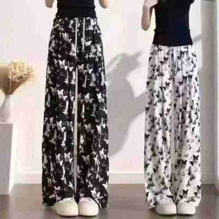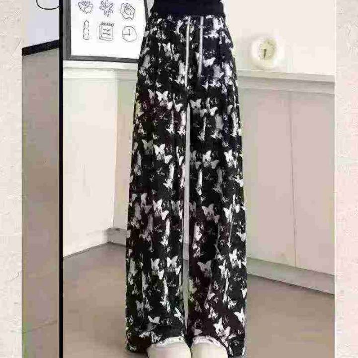 新中式水墨蝴蝶冰丝阔腿裤夏季国风裤女薄款休闲垂感直筒拖地裤子,垂感好,面料柔软舒适,夏天穿它凉感十足[哇],松紧腰不挑人,全部全新独立包装,品质,200件起分货[太阳]9.8