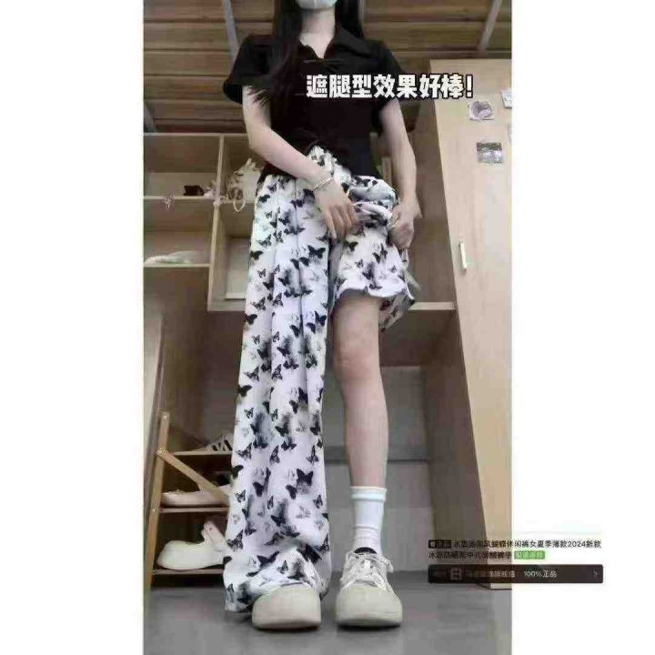 新中式水墨蝴蝶冰丝阔腿裤夏季国风裤女薄款休闲垂感直筒拖地裤子,垂感好,面料柔软舒适,夏天穿它凉感十足[哇],松紧腰不挑人,全部全新独立包装,品质,200件起分货[太阳]9.8