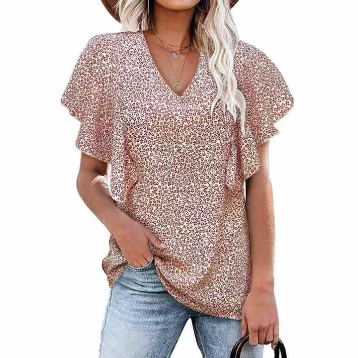 700件欧美时尚休闲V领印花荷叶边袖口短袖,整款,花型图案多,品质好,独立包装。s到5XL。梭织面料。亏本清。3.9