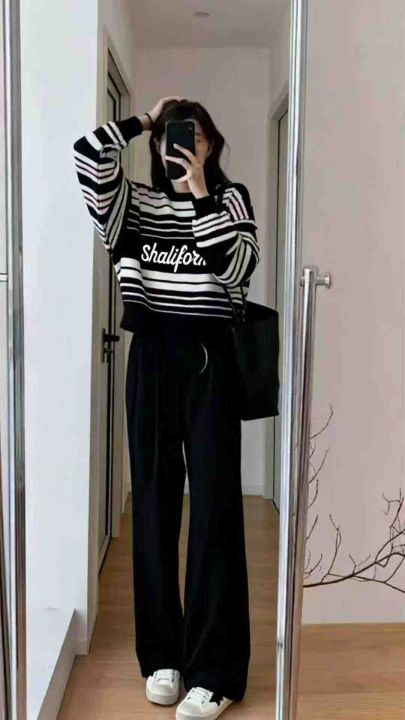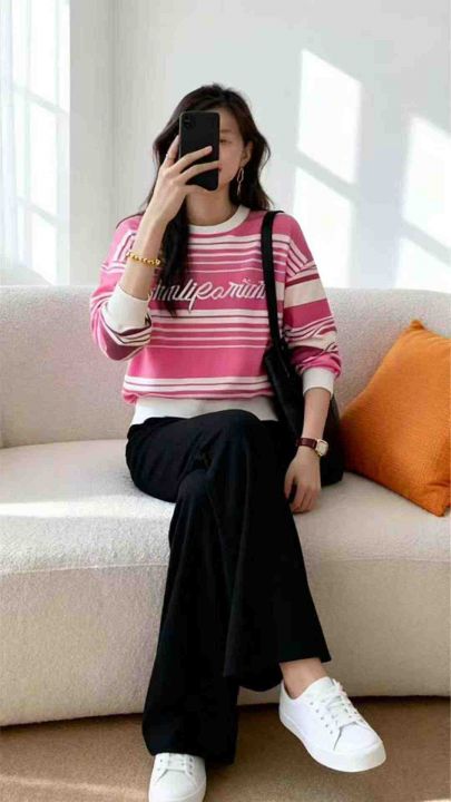 秋季新品撞色条纹刺绣宽松百搭针织套头毛衣,独立包装...
