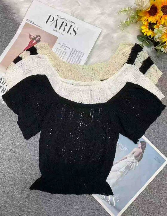 夏季新款法式镂空别致独特方领冰丝针织T恤,独立包装...