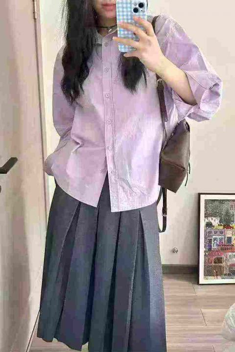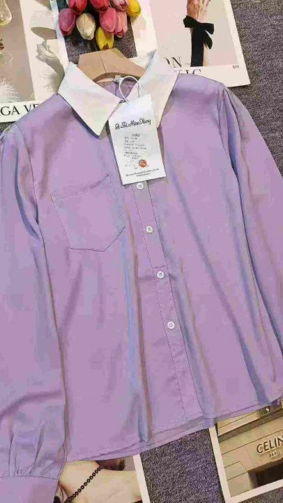 高级感紫色醋酸缎面通勤宽松长袖上衣,[爱心]70件左右,款号#7173,码数S-2XL,穿80-140斤,万佳档口货,原包装️无瑕疵,[666]实体店品质,(模特图仅供参考),分货加一
