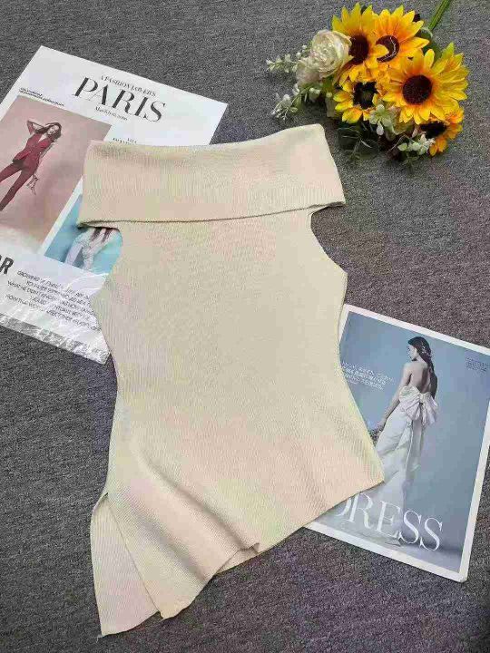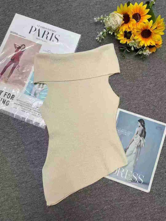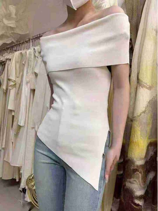 夏季新款法式一字肩不规则设计感冰丝翻领弹力修身露肩别致针织衫,独立包装,均码面料软糯舒适弹力大,85件,全清4.9元超低价秒杀!