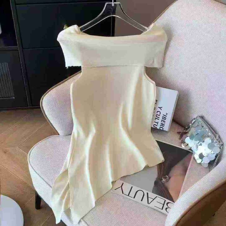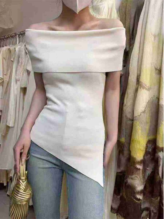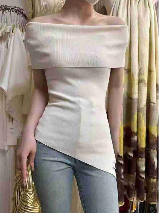 夏季新款法式一字肩不规则设计感冰丝翻领弹力修身露肩...