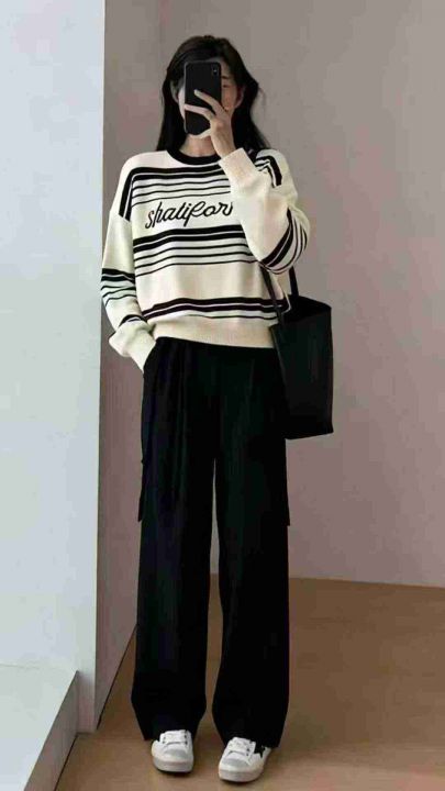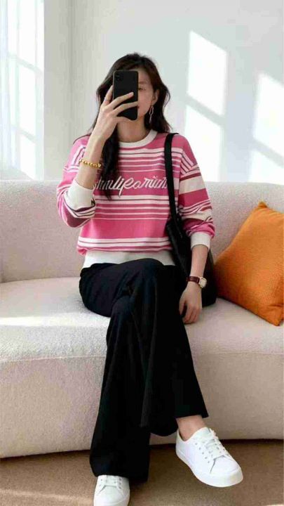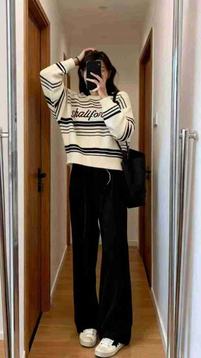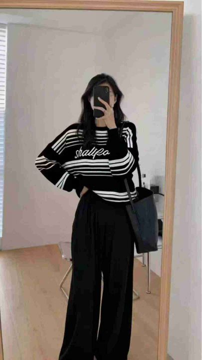 秋季新品撞色条纹刺绣宽松百搭针织套头毛衣,独立包装...