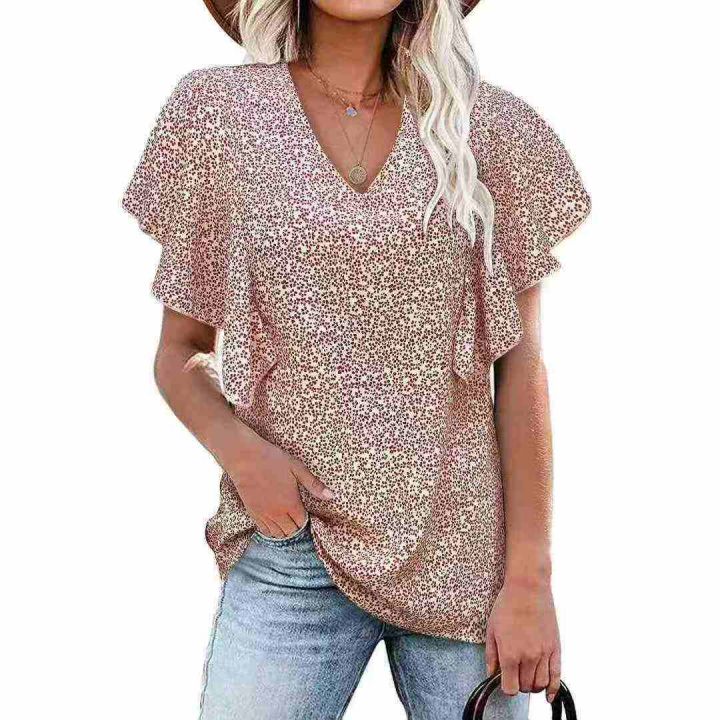 700件欧美时尚休闲V领印花荷叶边袖口短袖,整款,花型图案多,品质好,独立包装。s到5XL。梭织面料。亏本清。3.9