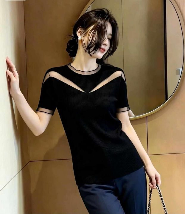 夏季新款蕾丝拼接弹力修身显瘦短袖针织衫,独立包装,均码面料柔软舒适弹力...