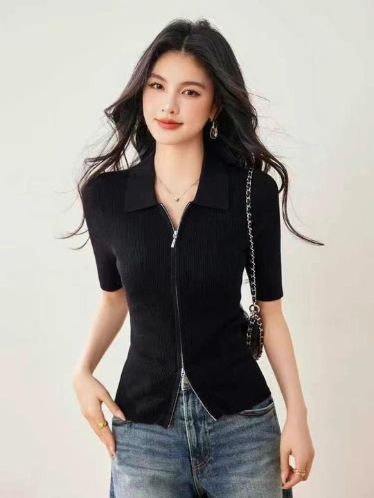 捡漏款,夏季新款Polo领双头拉链弹力修身显瘦针织短袖开衫,独立包装,均码...