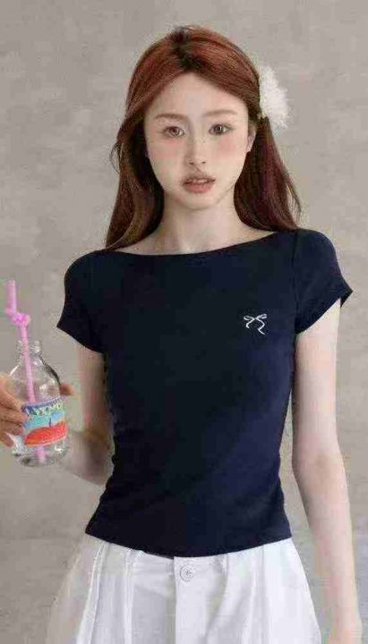夏季新款美式纯欲辣妹气质正肩印花弹力棉短袖T恤,独立包装,码数1-4码, 5...