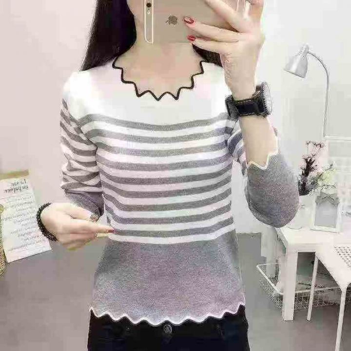 7.9清133件包芯纱女装秋冬新款针织打底衫,单款两色,套头条纹百搭上衣,面...