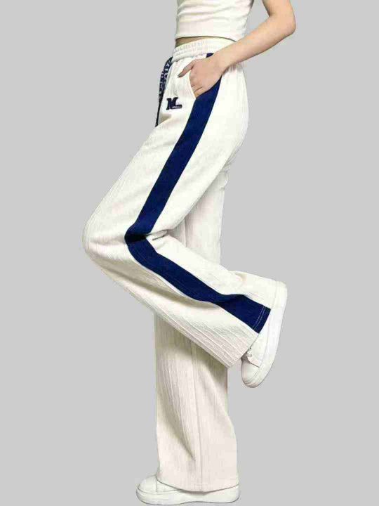 天猫精选230条,新款杏色拼蓝色条纹雪尼尔阔腿裤 吊牌价:599元,裤头内里...
