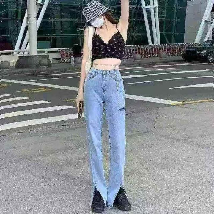 全清9.8垂坠感女装mm宽松显瘦高腰破洞开叉牛仔裤,网络图仅供参考,码数:XS-X...