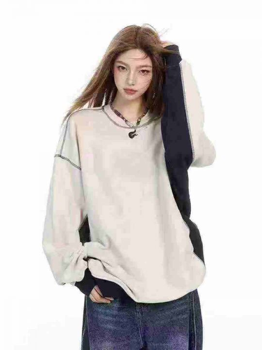 ☕️纯棉毛圈卫衣美式复古圆领拼接撞色插肩卫衣女春秋款上衣287件全清8.8元...