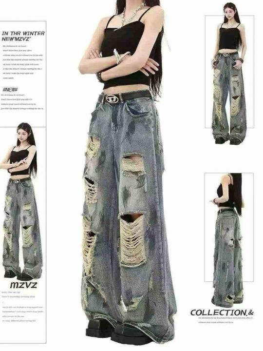复古扎染废土风破洞女牛仔裤水洗垂感阔腿拖地裤,码数XS-XXL,少量XS,面料...